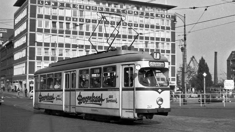 Im September 1961 rauscht der neue Großraumwagen auf der Linie 1 vor dem Neubau des Raiffeisenhauses durch das Sophienblatt zur „Doppelhaltestelle“ Hauptbahnhof, an der vier Straßenbahnlinien hielten. Im Hintergrund rechts im Bild, ist in der Auguste-Viktoria-Straße noch ein Wagen der Linie 7 zu erkennen, die hier ihren Endpunkt hatte.